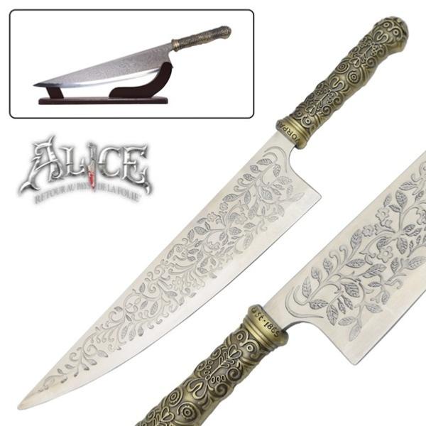 Fantastique poignard tiré du jeu vidéo Alice : Retour au pays de la folie (2011) et utilisé par Alice Liddell. Cette fidèle réplique en taille réelle a été soigneusement conçue à partir de la lame nommée "Vorpal" utilisée dans le jeu avec une attention particulière portée aux détails et aux finitions. Ce long couteau est doté d'une lame non coupante en acier inoxydable avec une finition brillante et de magnifiques gravures sur chaque face (prolongement de la lame dans la poignée). Le manche est en métal avec une finition bronze antique et de superbes gravures également sur toute sa surface (inscription de son nom "Vorpal" en haut du manche). La texture du manche en relief offre une excellente prise en main. Livrée avec un présentoir en bois peint en noir (29 x 9 x 6 cm), cette solide reproduction ravira les fans du jeu vidéo et les collectionneurs de couteaux originaux de haute qualité. À votre tour d'obtenir le poignard d'Alice pour vaincre la folie !