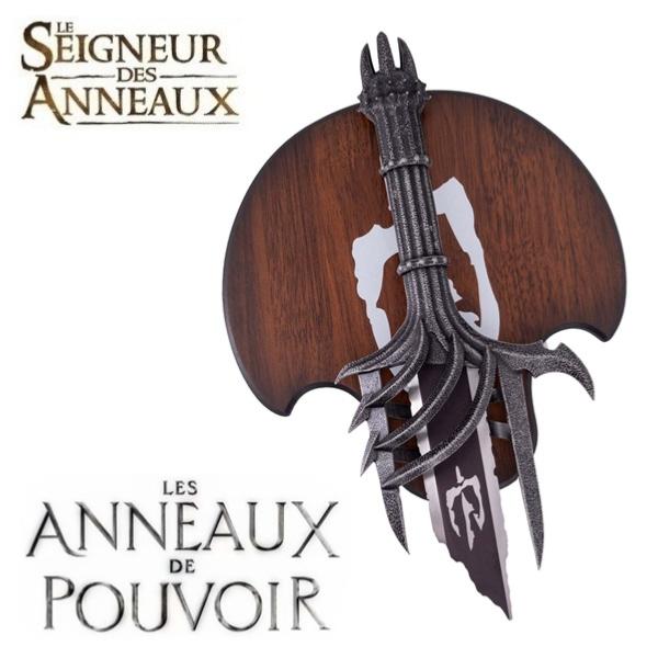 Fantastique épée brisée tirée de la série Les Anneaux de Pouvoir (depuis 2022) et utilisée par Sauron (Charlie Vickers). Cette fidèle réplique a été soigneusement conçue à partir de l'arme d'origine utilisée dans la série avec une attention particulière portée aux détails et aux finitions. D'une conception solide, elle est dotée d'une lame brisée non coupante en acier inoxydable 440 avec une finition noire (4,7 cm à son point le plus large) et la marque de Sauron sur sa base. La poignée, la garde (16,5 cm de large) et le pommeau (6 cm de long) sont finement ouvragés et entièrement fabriqués en métal avec une finition antique et rugueuse. Le manche offre une excellente prise en main (15 cm de long). Le support mural est en bois marron avec l'impression du symbole de Sauron (26 x 24 x 1,5 cm et 300 g). De haute qualité, cette reproduction exceptionnelle ravira les collectionneurs du Seigneur des Ténèbres.