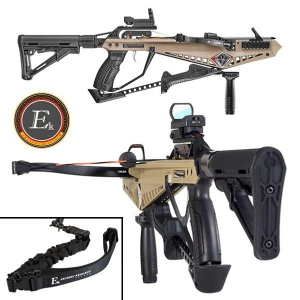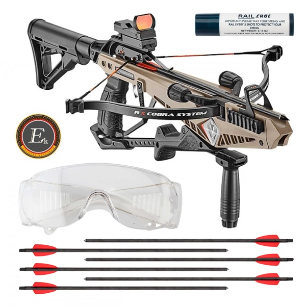 L'arbalète recurve (aussi appelée "recourbée" ou "classique") de la marque EK Archery Research (Taïwan - CR090BA-130) se distingue par son mécanisme d'armement automatique (Cobra System RX). En tirant vers le bas le levier sous la poignée, la corde est tirée sans effort vers l'arrière et l'arbalète est armée. De plus, elle est équipée d'un protège-main intégré, d'un cran de sûreté et d'un viseur avec hausse réglable qui peut être ajusté avec précision à la distance de tir souhaitée jusqu'à 20 m. Les branches sont en fibre de verre lui garantissant vitesse et résistance. Le corps est en polymère renforcé beige et noir. Dotée d'une technologie de pointe, elle est équipée d'un système anti-tir à vide pour encore plus de sécurité. Elle possède 4 rails Picatinny de 21 mm permettant d'ajouter des accessoires (supérieur, inférieur et latéral). Elle est livrée avec 6 carreaux en carbone de 38 cm de long (15"), un tube de cire pour corde et des lunettes de protection. Cette version de luxe inclut en plus : une crosse rétractable type AR15/M16, un viseur point rouge, une poignée verticale à l'avant et une sangle bandoulière à détachement rapide. Elle combine fonctionnalité et style, ce qui en fait un choix idéal pour tous ceux qui recherchent une arbalète fiable et facile à utiliser que ce soit pour le tir sportif ou le loisir sur des cibles en mousse rigide. Le kit est complet pour une utilisation immédiate et sera à assembler par vos soins (notice de montage incluse). Elle se démonte très facilement et très rapidement sans aucun outil pour le transport ou le stockage en toute sécurité.