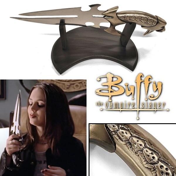 Superbe couteau tiré de la série Buffy contre les vampires (1997-2003) et utilisé par Buffy Summers (Sarah Michelle Gellar), la Tueuse de vampires. Offert par le maire, Richard Wilkins (Harry Groener) à Faith Lehane (Eliza Dushku) qui l'a utilisé dans un premier temps avant de le perdre, le poignard a ensuite été récupéré par Buffy… De haute qualité, cette fidèle réplique a été soigneusement conçue à partir de l'arme d'origine utilisée dans la série avec une attention particulière portée aux détails et aux finitions. Fabriquée d'après le couteau de la marque "United Cutlery Gil Hibben Jackal knife" (épuisé), cette reproduction non officielle possède une double lame aiguisée et pointue en acier inoxydable 440 (7,1 cm à son point le plus large). La lame forgé à double tranchant (vous pouvez l'affûter davantage avec une pierre à aiguiser) se prolonge dans la poignée en métal. Offrant une excellente prise en main, la poignée très confortable comporte des motifs en relief représentant des écailles de dragon (10 cm de long). La garde et le pommeau sont en métal avec une finition antique et brillante. Livré avec un présentoir en bois peint en noir (23,5 x 19 x 8,2 cm), ce collector très solide ravira les fans de Buffy et les amateurs de couteaux fonctionnels. Fabriquée à la main par un forgeron, chaque pièce est unique : la finition peut varier d'un poignard à l'autre.