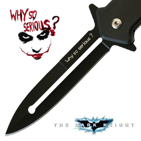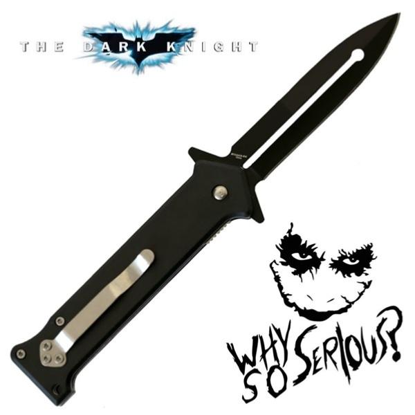Authentique couteau pliant tiré du film The Dark Knight : Le Chevalier noir (2008) et utilisé par le Joker (Heath Ledger), le psychopathe fou. De haute qualité, ce couteau de poche léger et facile à manier possède une lame en acier inoxydable 420 avec une finition noire pour éviter les reflets dans la nuit (2 cm à son point le plus large). Assistée par un ressort, la lame aiguisée sur un seul tranchant se déploie manuellement sans effort à l'aide d'un ergot sur le côté (ouverture flipper). Le texte "Why so serious ?" (qui signifie "Pourquoi si sérieux ?") est imprimé en blanc sur une des faces de la lame que vous pouvez affûter davantage avec une pierre à aiguiser. Le manche composé de deux plaques en ABS noir fixées avec des rivets offre une excellente prise en main (12 cm de long). Il comporte sur un côté un clip de ceinture en métal fixé avec trois vis. Le pommeau est doté d'un trou pour sécuriser l'arme avec un cordon si vous le souhaitez. Indispensable aux fans du super-vilain, cette solide pièce ravira les collectionneurs de couteaux élégants et fonctionnels.