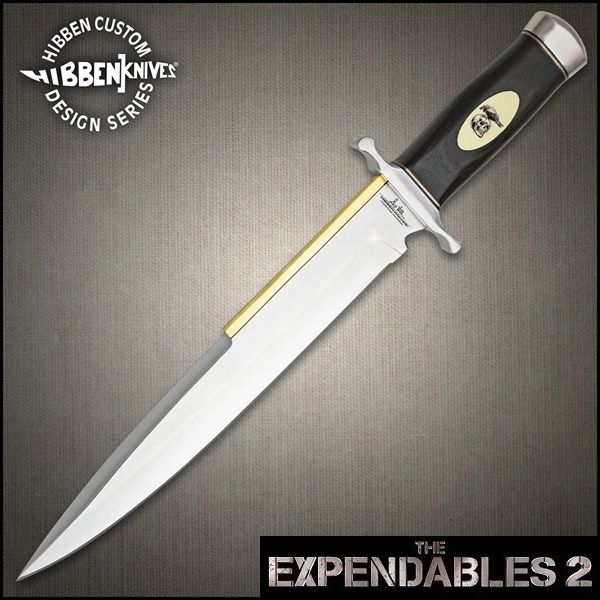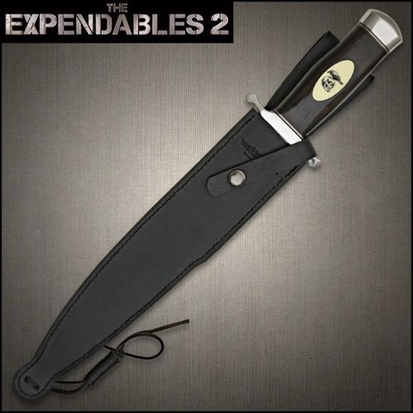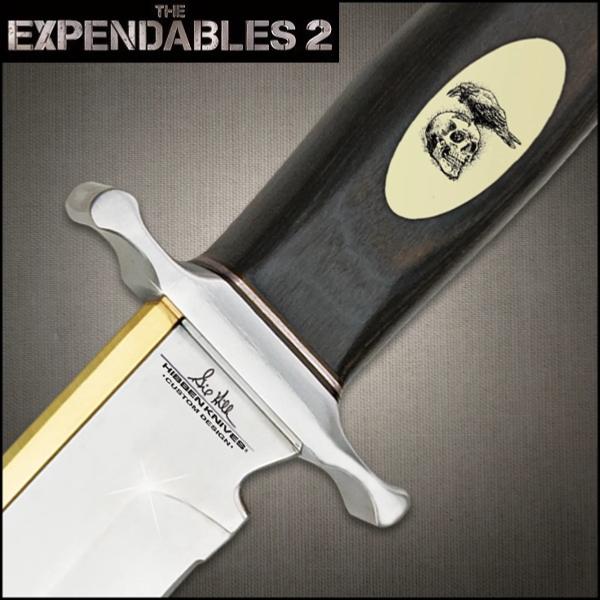 Authentique poignard tiré du film Expendables 2 : Unité spéciale (2012) et utilisé par Barney Ross (Sylvester Stallone), chef et cerveau de l'équipe. Conçue sous licence officielle par le designer Gil Hibben pour la marque United Cutlery (USA), cette réplique du couteau de combat possède une lame aiguisée en acier inoxydable 3Cr13 avec une finition miroir poli et un dos en laiton massif (vous pouvez l'affûter davantage avec une pierre à aiguiser). Dans un style "Arkansas Toothpick", la lame se prolonge dans la poignée en bois véritable marron foncé qui comporte un médaillon en ivoire synthétique (5 cm de long) sur un côté. Le médaillon est imprimé avec le symbole des mercenaires : un corbeau noir sur un crâne humain. Dotée de deux entretoises en acier, la poignée offre une excellente prise en main. De haute qualité, ce long couteau équilibré comprend une garde (8,8 cm) et un pommeau en acier massif avec une finition brillante. La base de la lame est gravée d'un côté avec la signature de Gil Hibben et le texte "Hibben Knives - Custom Design" et de l'autre avec le texte "Copyright 2012 - The Expendables II" et le logo "Hibben Knives". Livrée avec un Certificat d'Authenticité dans sa boîte officielle imprimée en couleurs avec le logo "The Expendables 2" (47 x 11 x 4,8 cm), cette fidèle reproduction inclut un étui en cuir véritable noir cousu (44 cm de long) avec gravure du logo "Hibben Knives - Custom Design", fermeture à bouton-pression, passant de ceinture et cordon en cuir pour le fixer à la jambe (160 g). Indispensable aux fans de Stallone, ce collector ravira les amateurs de pièces de collection fonctionnelles à la finition parfaite.