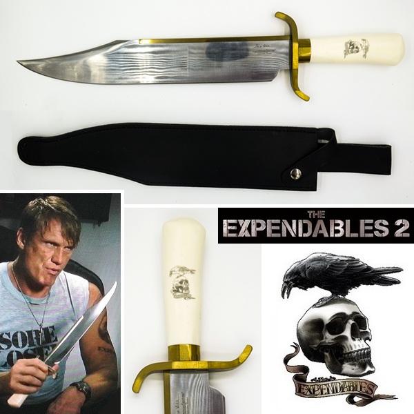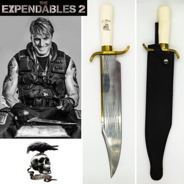 Authentique couteau de chasse tiré du film Expendables 2 : Unité spéciale (2012) et utilisé par Gunnar Jensen (Dolph Lundgren), redoutable expert et membre de l'équipe des mercenaires dirigée par Barney Ross (Sylvester Stallone). De haute qualité, cette fidèle réplique en taille réelle a été soigneusement conçue à partir de l'arme d'origine utilisée dans le film avec une attention particulière portée aux détails et aux finitions. Cette solide reproduction est dotée d'une lame aiguisée et pointue (6 cm à son point le plus large) en acier inoxydable 440 avec une finition brillante (vous pouvez l'affûter davantage avec une pierre à aiguiser). Le dos de la large lame fixe de type "Bowie" est renforcé par une barre en laiton massif qui permet de bloquer la lame d'un adversaire lors d'une parade (prolongement de la lame dans la poignée). La garde (12 cm de large) et la sous-garde sont également en laiton massif. Offrant une excellente prise en main, la poignée est en ABS imitation ivoire avec l'impression du logo des mercenaires sur un côté (12,3 cm de long). Livré dans un fourreau en cuir véritable noir cousu avec un passant de ceinture et une fermeture à bouton-pression (51,2 cm de long et 240 g), ce grand couteau de chasse forgé à la main est indispensable aux fans de la saga et aux amateurs de poignards de combat équilibrés et fonctionnels.