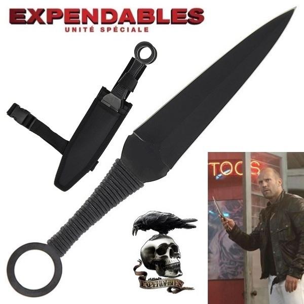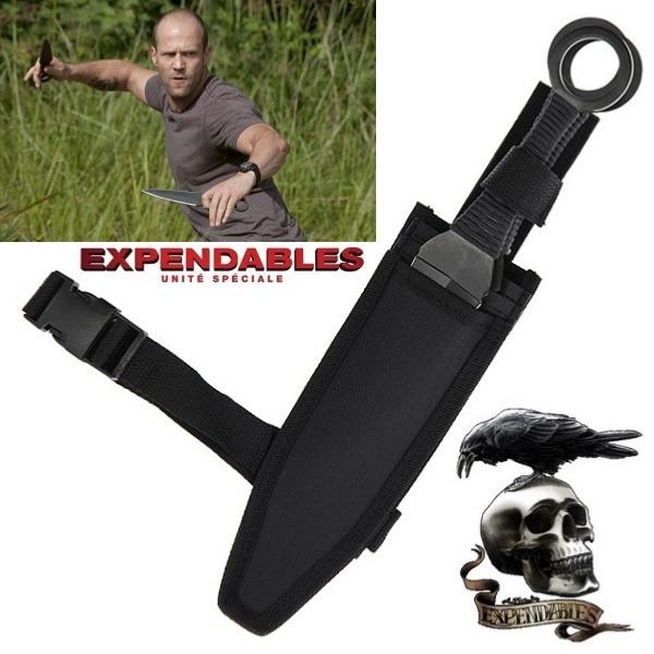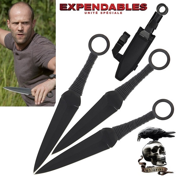 Authentique lot de 3 couteaux de lancer tirés du film Expendables : Unité spéciale (2010) et utilisés par Lee Christmas (Jason Statham), excellent spécialiste et membre de l'équipe des mercenaires dirigé par Barney Ross (Sylvester Stallone). De haute qualité, ces fidèles répliques en taille réelle ont été soigneusement conçues à partir des armes d'origine utilisées dans le film avec une attention particulière portée aux détails et aux finitions. Fabriquées d'après les couteaux de la marque "United Cutlery Expendables Kunai Three-Piece Set", ces reproductions non officielles possèdent des lames aiguisées à double tranchant en acier inoxydable 420 avec une finition anodisée noire pour éviter les reflets dans la nuit (4,3 cm à son point le plus large). Parfaitement équilibrées et précises, elle comportent des pommeaux en forme d'anneau (diamètre : 4,1 cm). Les poignées (8,5 cm de long) sont entourées d'un cordon en nylon noir pour offrir une bonne prise en main. Livrées dans un robuste étui en nylon noir (32 cm de long et 65 g) avec un passant de ceinture, une fermeture auto-agrippante et une sangle pour le fixer à la jambe (fermeture à clip en PVC noir), ces solides reproductions sont indispensables aux fans de Lee Christmas et raviront les amateurs de couteaux de lancer fonctionnels sur cibles en bois tendre ou en paille.