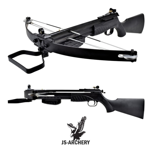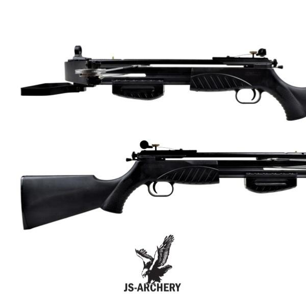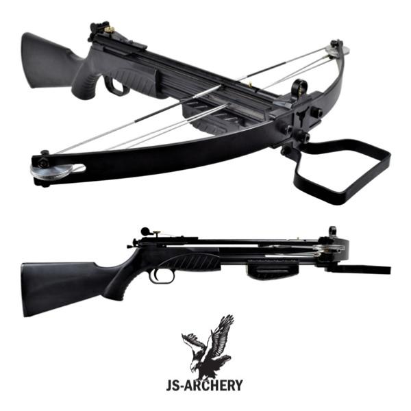 Le fusil arbalète à poulies de la marque JS-Archery (Taïwan - CF 502C) est compatible avec les flèches et les billes grâce à son magasin supérieur pouvant contenir jusqu'à 26 billes en acier de 8 mm. Le mécanisme d'armement est simple : un étrier métallique à l'avant permet de mettre le pied pour tirer la corde sans effort vers l'arrière et le fusil arbalète à poulies est armé. De plus, il est équipé d'un protège-doigt intégré, d'un cran de sûreté et d'un viseur avec hausse réglable qui peut être ajusté avec précision à la distance de tir souhaitée jusqu'à 20 m. Les branches et les poulies sont en métal lui garantissant vitesse et résistance. Le corps est en polymère avec une finition noire. La crosse d'épaule en polymère noir est ergonomique et confortable. Le chargeur supérieur en métal permet de mettre 26 billes en acier de 8 mm. Il est livré avec 20 billes en acier de 8 mm et 3 carreaux en plastique et aluminium de 7,6 cm de long. Combinant fonctionnalité et style, il est le choix idéal pour tous ceux qui recherchent un fusil arbalète à poulies fiable et facile à utiliser que ce soit pour le tir sportif ou le loisir sur des cibles en mousse. Le kit est complet pour une utilisation immédiate et sera à assembler par vos soins (visserie de montage incluse).