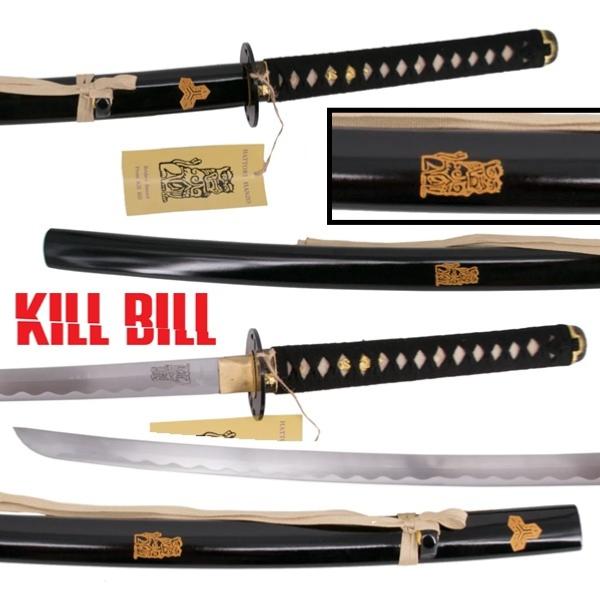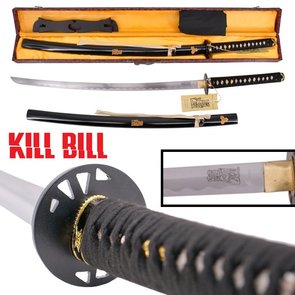 Authentique katana forgé tiré de la duologie Kill Bill (2003-2004) et utilisé par Beatrix Kiddo (Uma Thurman), alias la Mariée/Black Mamba après l'avoir reçu en cadeau de la part du maître forgeron Hattori Hanzo (Sonny Chiba). De haute qualité, ce sabre de samouraï suit les techniques traditionnelles de forgeage à la main. Très aiguisée, la lame courbe est en acier au carbone AISI 1045 (3,2 cm à son point le plus large). Un lion Japonais, symbole de bravoure est gravé sur une face à la base de la lame. La garde (7 cm de diamètre et 5 mm d'épaisseur) est en métal avec une finition noire. La poignée en bois dur (24 cm de long) est entourée de tresses traditionnelles en nylon noir sur une véritable peau de raie blanche. Deux chevilles sont insérées dans la poignée pour fixer la lame faisant de ce sabre un katana de combat complètement fonctionnel (il peut être démonté pour l'entretien). Deux dragons en métal doré ornent chaque côté de la poignée. Le fourreau de luxe en bois dur (76 cm de long et 300 g) est recouvert d'une peinture laquée noire et comporte deux symboles gravées avec une finition dorée ainsi qu'un ruban en nylon beige (sageo) fixé au niveau du Kurigata. Le présentoir est en bois peint en noir mat avec des protections en velours rouge (35 x 14 x 7 cm et 180 g). Le superbe coffret en bois (960 g) recouvert de tissu noir brodé avec du fil rouge représentant des dragons et des fleurs est doublé à l'intérieur de satin jaune doré et se ferme avec deux fermoirs métalliques (110 x 11 x 8 cm). Livrée dans un sac de protection en tissu noir, cette pièce exceptionnelle ravira les fans de l'héroïne et les collectionneurs de katanas forgés dans les règles de l'art pour l'entraînement à la coupe sur des rouleaux de paille tressée. Hattori Hanzo dit à Beatrix Kiddo à la fin du chapitre 5 : "La vengeance n'est jamais un chemin linéaire. C'est une forêt. Et comme dans une forêt, il est facile de s'y perdre. De s'égarer. D'oublier d'où l'on vient".