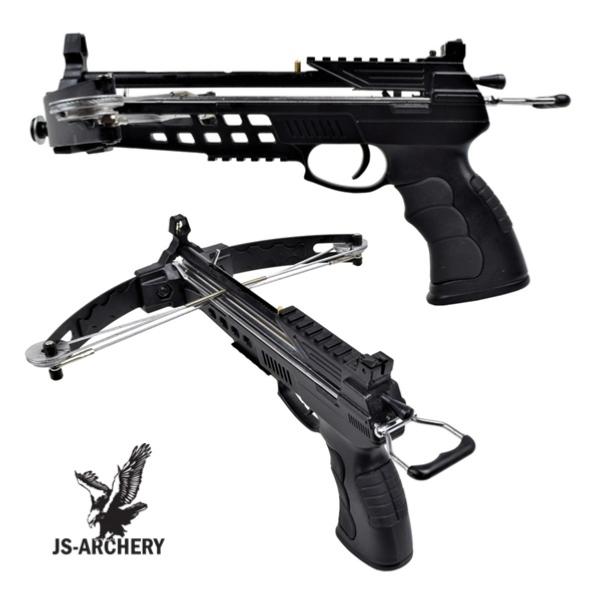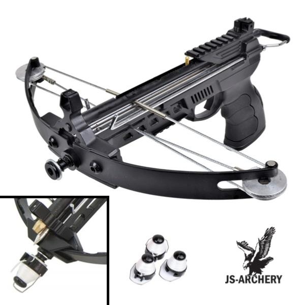 Le pistolet arbalète à poulies de la marque JS-Archery (Taïwan - CF 503C) se distingue par sa petite taille par rapport à la puissance qu'il propose grâce à ses poulies en métal. Le mécanisme d'armement est simple : en tirant le crochet en aluminium situé à l'arrière, la corde est tirée sans effort vers l'arrière et le pistolet arbalète est armé. De plus, il est équipé d'un protège-doigt intégré, d'un cran de sûreté et d'un viseur avec hausse réglable qui peut être ajusté avec précision à la distance de tir souhaitée jusqu'à 20 m. Les branches sont en fibre de verre lui garantissant vitesse et résistance. Le corps est en métal avec une finition noire. La poignée ergonomique en caoutchouc offre une excellente prise en main. Le chargeur supérieur permet de mettre 12 billes en acier de 6 mm (rails supérieurs et inférieurs en métal de 11 mm). Il est livré avec 20 billes en acier de 6 mm, 6 carreaux en plastique et aluminium de 16,5 cm de long, 3 carreaux en plastique et aluminium de 7,6 cm de long et 3 roues porte-ligne pour la pêche. Ces derniers se fixent sur l'avant du pistolet arbalète : le fil de pêche en nylon s'attache sur les extrémités des 3 carreaux qui possèdent des crochets sur leurs pointes. Combinant fonctionnalité et style, il est le choix idéal pour tous ceux qui recherchent un pistolet arbalète fiable et facile à utiliser que ce soit pour la pêche, le tir sportif ou le loisir sur des cibles en mousse. Le kit est complet pour une utilisation immédiate et sera à assembler par vos soins (visserie de montage incluse).