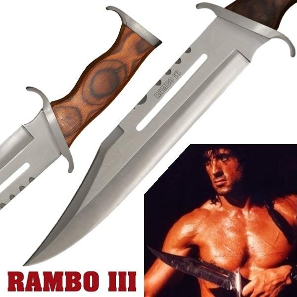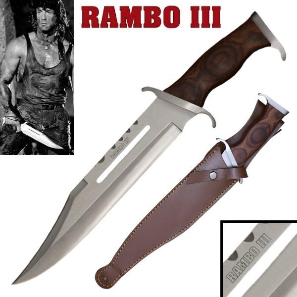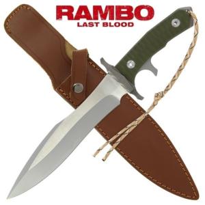 Authentique poignard de combat tiré du film Rambo 3 (1988) et utilisé par John James H. Rambo (Sylvester Stallone), le dernier survivant d'un commando d'élite formé durant la guerre du Vietnam. De haute qualité, cette réplique en taille réelle possède une lame de type Bowie en acier inoxydable 440 qui se prolonge dans la poignée. Aiguisée et pointue, la lame (4,8 cm à son point le plus large) comporte un ricasso (zone franche du couteau juste au-dessus de la poignée) pour l'adhérence et la maniabilité (vous pouvez l'affûter davantage avec une pierre à aiguiser). La lame est gravée sur une face avec le texte "RAMBO III". La solide poignée (12 cm de long) en bois de Pakka (matériau noble à base de bois et de résine compressés à chaud) offre une excellente prise en main. La garde (9,4 cm de large) et le pommeau (6,4 cm de large) sont en acier massif avec une finition polie. Le robuste fourreau en cuir cousu marron (110 g et 45,6 cm de long) comprend une fermeture à bouton-pression, un passant de ceinture et un cordon en cuir marron pour le fixer à la jambe. Indispensable aux fans du héros, cette fidèle reproduction ravira les collectionneurs de couteaux de chasse équilibrés et fonctionnels.
