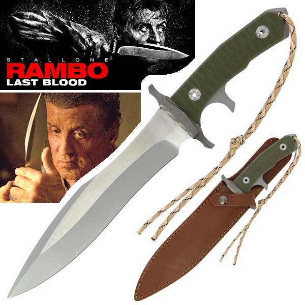 Authentique couteau de chasse tiré du film Rambo 5 : Last Blood (2019) et utilisé par John James H. Rambo (Sylvester Stallone), le dernier survivant d'un commando d'élite formé durant la guerre du Vietnam. De haute qualité, cette fidèle réplique est fabriquée à partir d'une seule pièce d'acier inoxydable 440 avec une finition satinée (4,5 cm à son point le plus large). La lame aiguisée se prolonge dans la poignée qui est composée de deux plaques de G10 vert kaki sculpté (durable, léger et robuste, le G10 est de la fibre de verre trempée dans une résine, puis comprimée et durcie par un procédé de cuisson). Fixée avec deux rivets en acier, la poignée offre une excellente prise en main (13 cm de long) tandis que le pommeau est pointu pour servir de brise-vitre en cas de danger et est doté d'un trou pour passer le cordon en nylon afin de sécuriser l'arme. La lame forme également la garde (9 cm de large) et le crochet dans le manche pour une meilleure préhension. La garde est renforcée avec deux parties en acier massif. Le fourreau en cuir cousu marron comporte un passant de ceinture et une fermeture à bouton-pression qui passe au niveau de la garde (100 g et 37,7 cm de long). Cette reproduction en taille réelle ravira les fans du héros et les collectionneurs de couteaux tactiques, équilibrés et fonctionnels.