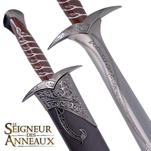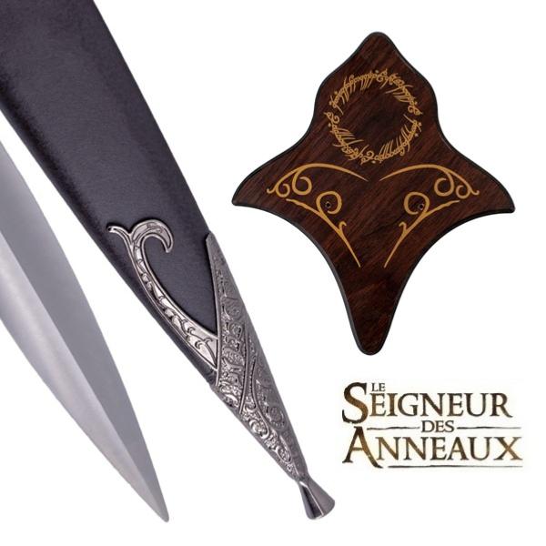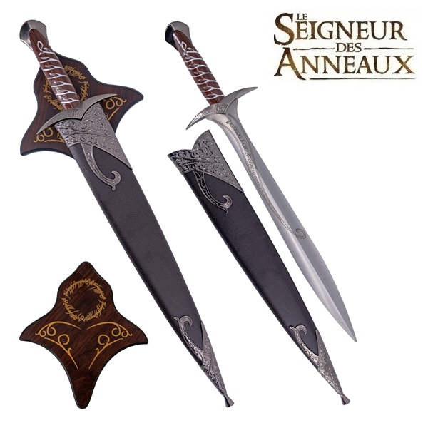 Magnifique épée tirée de la trilogie Le Seigneur des Anneaux (2001-2003) et utilisée par Frodon Sacquet (Elijah Wood), le célèbre Hobbit qui porta l'Anneau Unique jusqu'à la Montagne du Destin afin de le détruire. Nommée "Dard" ("Sting" en anglais), la dague lui fut donnée par les Elfes pour lui servir d'épée courte... De haute qualité, cette fidèle réplique a été soigneusement conçue à partir de l'arme d'origine utilisée dans la trilogie avec une attention particulière portée aux détails et aux finitions. D'une conception solide, elle est dotée d'une lame non coupante à double tranchant en acier inoxydable 440 (5 cm à son point le plus large) avec des gravures elfiques de chaque côté (prolongement de la lame dans la poignée). La poignée en métal peint en argenté et en marron imitation bois offre une excellente prise en main (15,5 cm de long). La garde gravée (16,3 cm de large) et le pommeau (5,4 cm de large) sont en métal avec une finition antique. Le fourreau est en bois peint en noir et comprend des garnitures en métal avec une finition antique (58 cm de long et 340 g). Incluant 2 crochets en métal doré, la plaque murale en bois est imprimée avec une peinture dorée qui représente des décorations et des écritures elfiques (29,2 x 25,5 x 1,2 cm et 290 g). Cette superbe reproduction ravira les fans de la trilogie et les collectionneurs d'épées courtes à la finition parfaite.