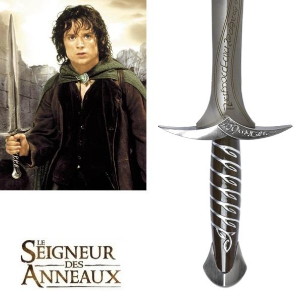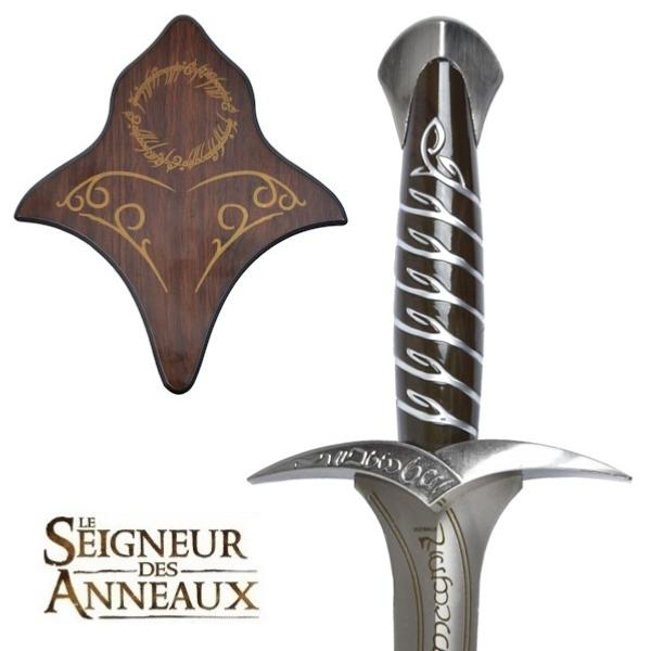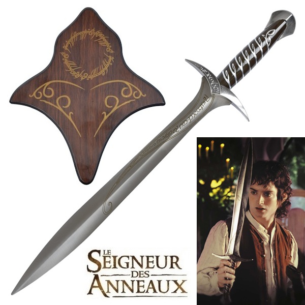 Magnifique épée tirée de la trilogie Le Seigneur des Anneaux (2001-2003) et utilisée par Frodon Sacquet (Elijah Wood), le célèbre Hobbit qui porta l'Anneau Unique jusqu'à la Montagne du Destin afin de le détruire. Nommée "Dard" ("Sting" en anglais), la dague lui fut donnée par les Elfes pour lui servir d'épée courte... De haute qualité, cette fidèle réplique a été soigneusement conçue à partir de l'arme d'origine utilisée dans la trilogie avec une attention particulière portée aux détails et aux finitions. D'une conception solide, elle est dotée d'une lame non coupante à double tranchant en acier inoxydable 440 (5 cm à son point le plus large) avec des gravures elfiques de chaque côté (prolongement de la lame dans la poignée). La poignée en métal peint en argenté et en marron imitation bois offre une excellente prise en main (15,5 cm de long). La garde gravée (16,3 cm de large) et le pommeau (5,4 cm de large) sont en métal avec une finition antique. Incluant 2 crochets en métal doré, la plaque murale en bois est imprimée avec une peinture dorée qui représente des décorations et des écritures elfiques (29,2 x 25,5 x 1,2 cm). Cette superbe reproduction ravira les fans de la trilogie et les collectionneurs d'épées courtes à la finition parfaite.