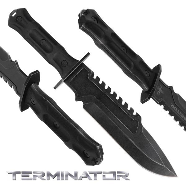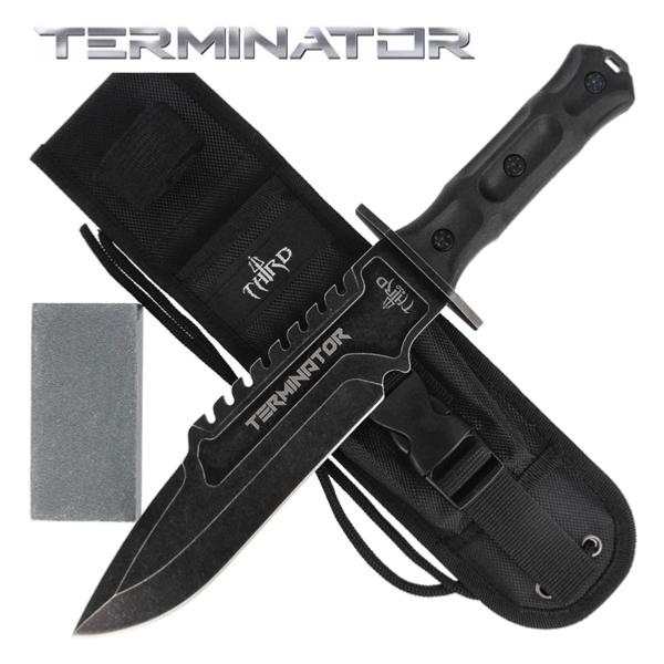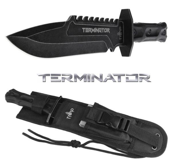 Authentique couteau tactique inspiré de la saga Terminator (depuis 1984). De haute qualité, cette solide reproduction équilibrée possède une lame fixe de type "Bowie" en acier inoxydable 420 avec une finition noire mate. La lame pointue est aiguisée sur un seul tranchant (vous pouvez l'affûter davantage avec la pierre à aiguiser incluse dans le fourreau) et comporte une partie du dos en dents de scie (5,4 cm à son point le plus large). Le texte "Terminator" est imprimé sur une des faces de la lame. Le manche composée de deux plaques en ABS noir fixées avec trois rivets en acier peint en noir offre une prise en main sûre et confortable, même dans des conditions extrêmes (12,4 cm de long). La garde est en métal avec une finition noire mate également (7,4 cm de long) alors que le pommeau est doté d'un trou pour sécuriser l'arme avec un cordon. La pierre à aiguiser incluse garantit que la lame reste toujours affûtée et prête à l'emploi en toutes circonstances : elle est rangée dans sa pochette sécurisée par une fermeture à clip en ABS noir (10 x 5 x 1,5 cm et 145 g). Livré dans un étui en nylon noir avec un passant de ceinture, une fermeture auto-agrippante, un cordon noir pour l'attacher à la jambe et une pochette sur le devant pour la pierre à aiguiser (33,5 cm de long et 170 g), ce couteau tactique vous aidera à mener à bien vos aventures en toute sécurité et sera indispensable aux amateurs de couteaux fonctionnels qui offrent d'excellentes performances de coupe pour diverses activités de plein air (camping, randonnée, chasse ou expéditions de survie).