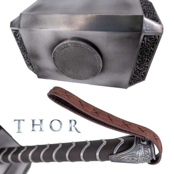 Superbe marteau tiré de la saga Thor (depuis 2011) et utilisé par Thor (Chris Hemsworth), le Dieu du Tonnerre membre des Avengers. Nommée "Mjolnir", cette réplique en taille réelle est entièrement fabriquée en métal à partir du marteau d'origine utilisé dans les films avec une attention particulière portée aux détails et aux finitions. La tête du marteau en acier avec une finition antique est ornée de gravures Asgardiens alors que le sommet inclut des runes gravées en cercle qui signifient : "Quiconque brandit ce marteau, s'il en est digne, sera investi du pouvoir de Thor". Le manche en métal peint en marron (35 cm de long) comporte des anneaux en métal pour une excellente prise en main. Le pommeau finement décoré en métal avec une finition antique également (5 cm de long) possède une sangle en cuir véritable marron (25 cm de long) pour sécuriser le marteau. Le socle de présentation (28 x 24 x 8,5 cm) est en résine dure qui imite la pierre. Idéale pour compléter un cosplay ou pour offrir en cadeau, cette reproduction de haute qualité ravira les collectionneurs de pièces exceptionnelles à la finition parfaite (attention : il est lourd !).