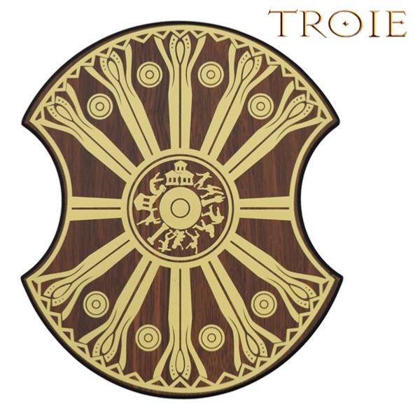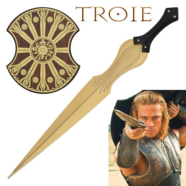 Superbe épée courte tirée du film Troie (2004) et utilisée par Achille (Brad Pitt). Cette fidèle réplique a été soigneusement conçue à partir de l'arme utilisée dans le film avec une attention particulière portée aux détails et aux finitions. De haute qualité, elle possède une lame non coupante en acier inoxydable de forme spécifique avec une finition dorée et des gravures sur chaque face (prolongement de la lame dans la poignée). Offrant une excellente prise en main, la magnifique poignée en métal est renforcée avec de l'ABS noir finition mate (17,5 cm de long). Livrée avec un support mural en bois marron en forme du bouclier d'Achille imprimé en sérigraphie dorée, cette solide reproduction ravira les fans du héros et les collectionneurs de pièces originales parfaitement équilibrées. À votre tour de posséder l'épée du soldat légendaire !